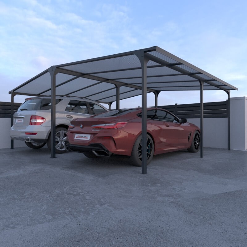 Carport double aluminium blanc ou gris, standard 2 x (5000 x 3000 mm), hauteur totale 2380 mm.