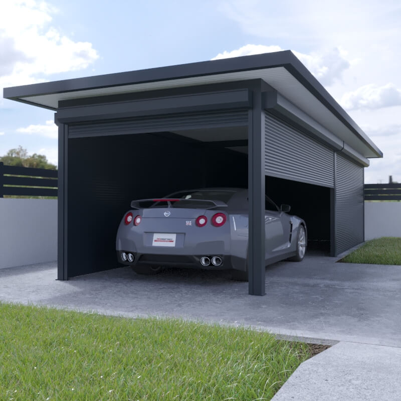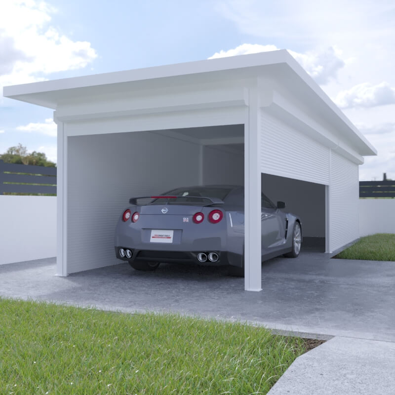 Abri de voiture composé de 6 volets enroulables motorisés. Largeur : 6000 mm. Profondeur : 3000 mm. Blanc ou gris.