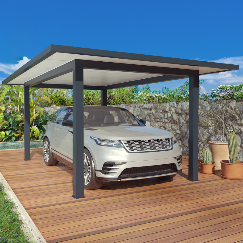 Carport aluminium toit plat autoporté avec débord de 50 cm, toutes couleurs, sur mesure.