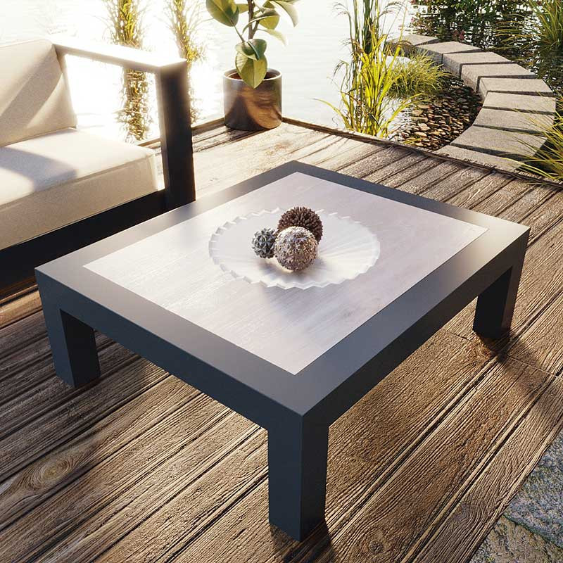 Table basse Mehetia, largeur 1200 mm, profondeur 1200 mm, hauteur 400 mm, en tube aluminium 100 x 100 mm et plateau céramique.