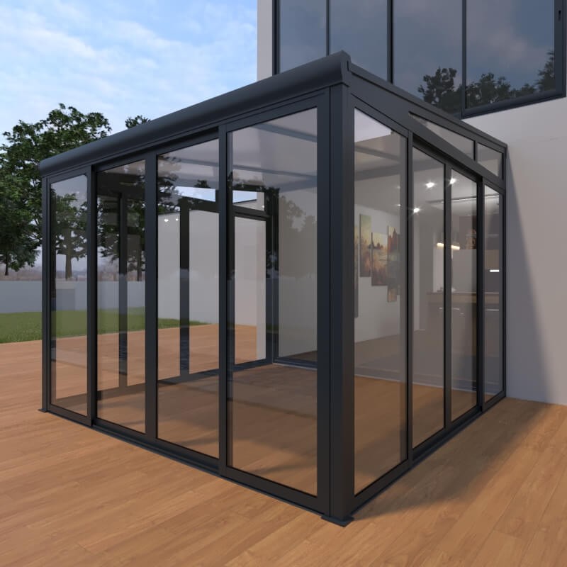 Pergolanda Top Prix 3x3 mètres, composée d'une pergola plus trois fermetures de pergola constitué par des baies coulissantes en aluminium sans rupture thermique.