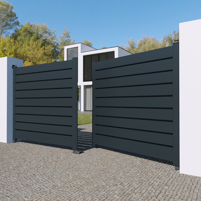 Portail Orlando aluminium à battant 2 vantaux plein lame standard, hauteur 1200 mm ou 1600 mm, à motoriser.