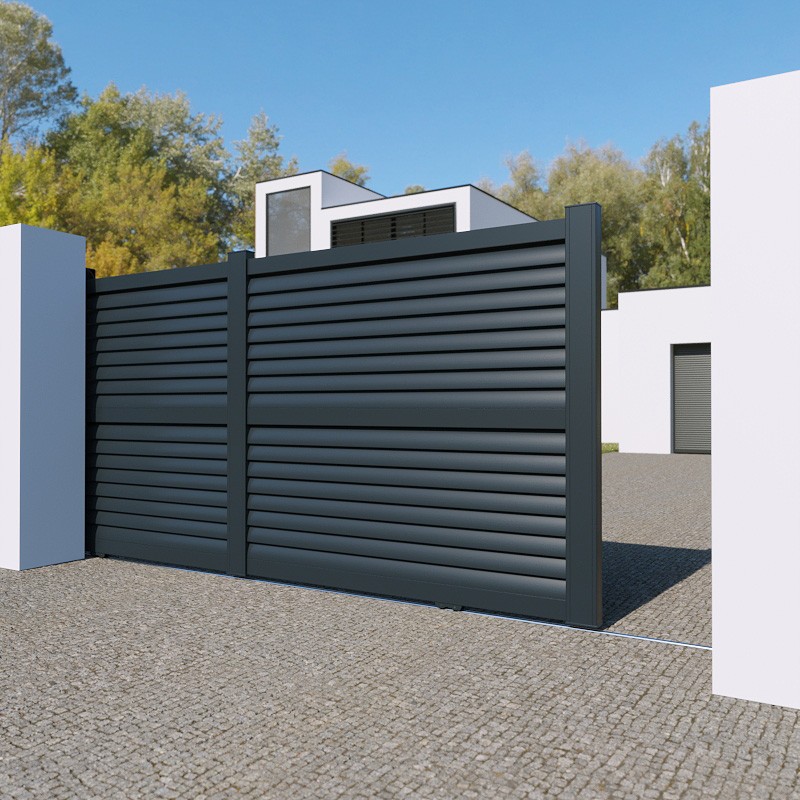 Portail aluminium Phoenix coulissant 2 vantaux sur mesure à motoriser. Largeur entre piliers max : 5000 mm. Hauteur : 2000 mm.
