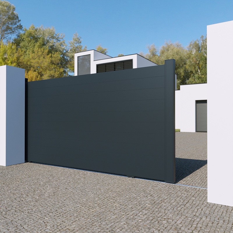 Portail aluminium Las Vegas coulissant sur mesure à motoriser. Largeur entre piliers max : 5000 mm. Hauteur max : 2000 mm.