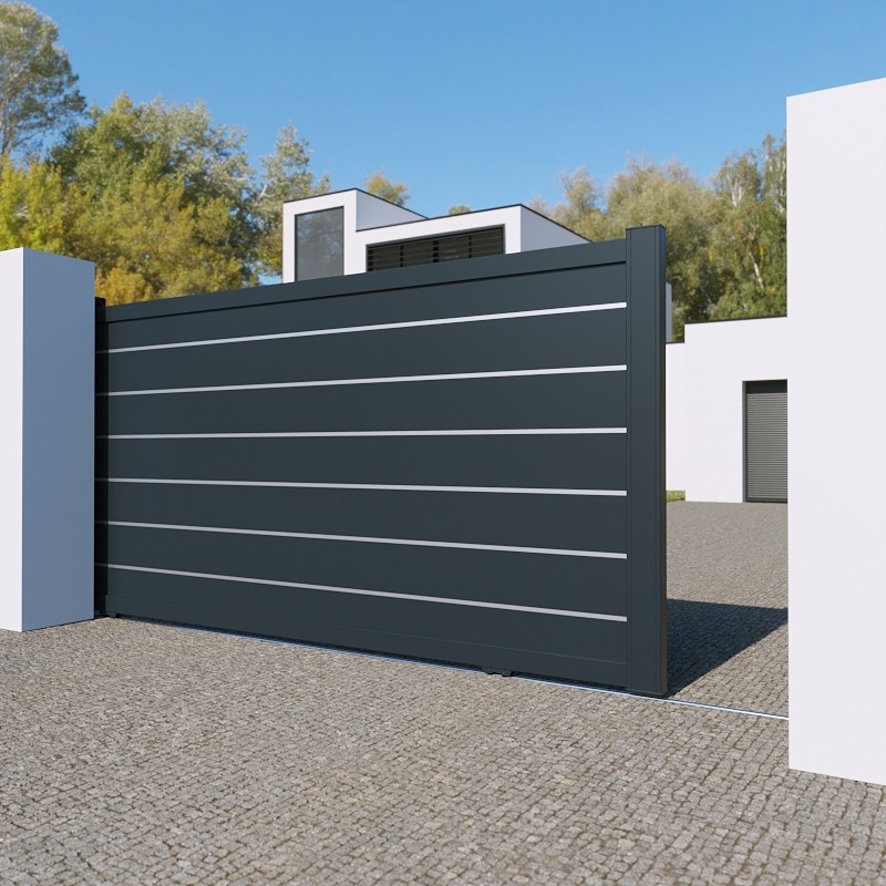 Portail aluminium Dallas coulissant sur mesure à motoriser. Largeur entre piliers max : 5000 mm. Hauteur max : 2100 mm.