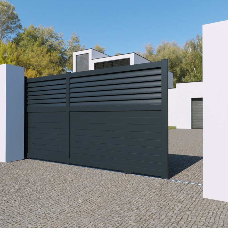 Portail coulissant 2 vantaux Detroit en aluminium standard, semi ajouré, hauteur 1800 mm.