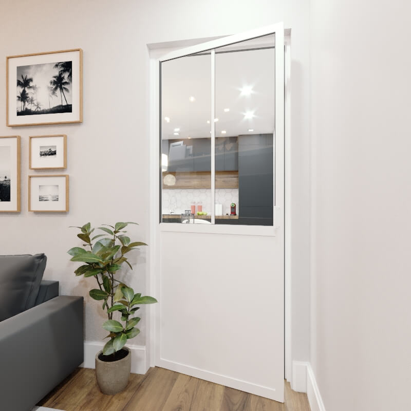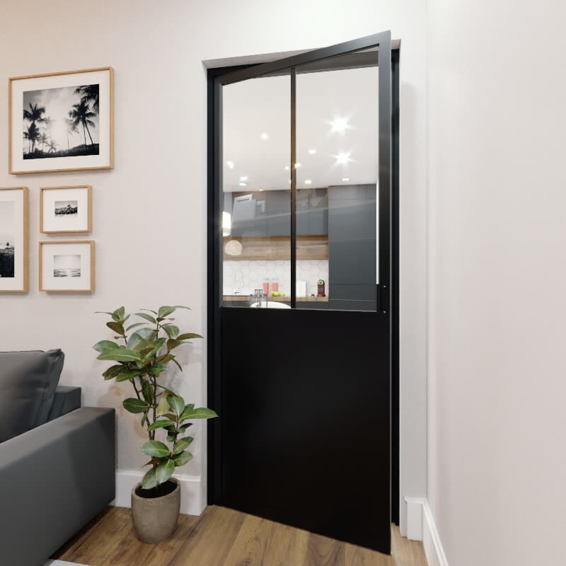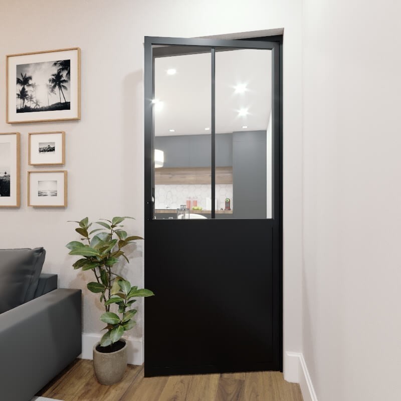 Porte verrière acier type Atelier sur mesure, noir RAL 9005, largeur MAXIMUM 1000 mm, hauteur MAXIMUM 2500 mm, soubassement hauteur 1000 mm (avec ou sans).