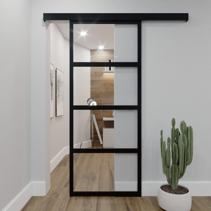 Porte coulissante en aluminium type Atelier, modèle Contemporain, pour USAGE INTÉRIEUR UNIQUEMENT.